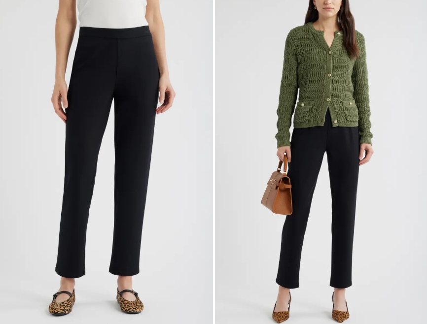 Ponte pants are a good bridge between leggings and tailored trousers. The knit is thick, smooth, and stretchy, so they feel comfortable, but the fabric has enough structure to look polished.
